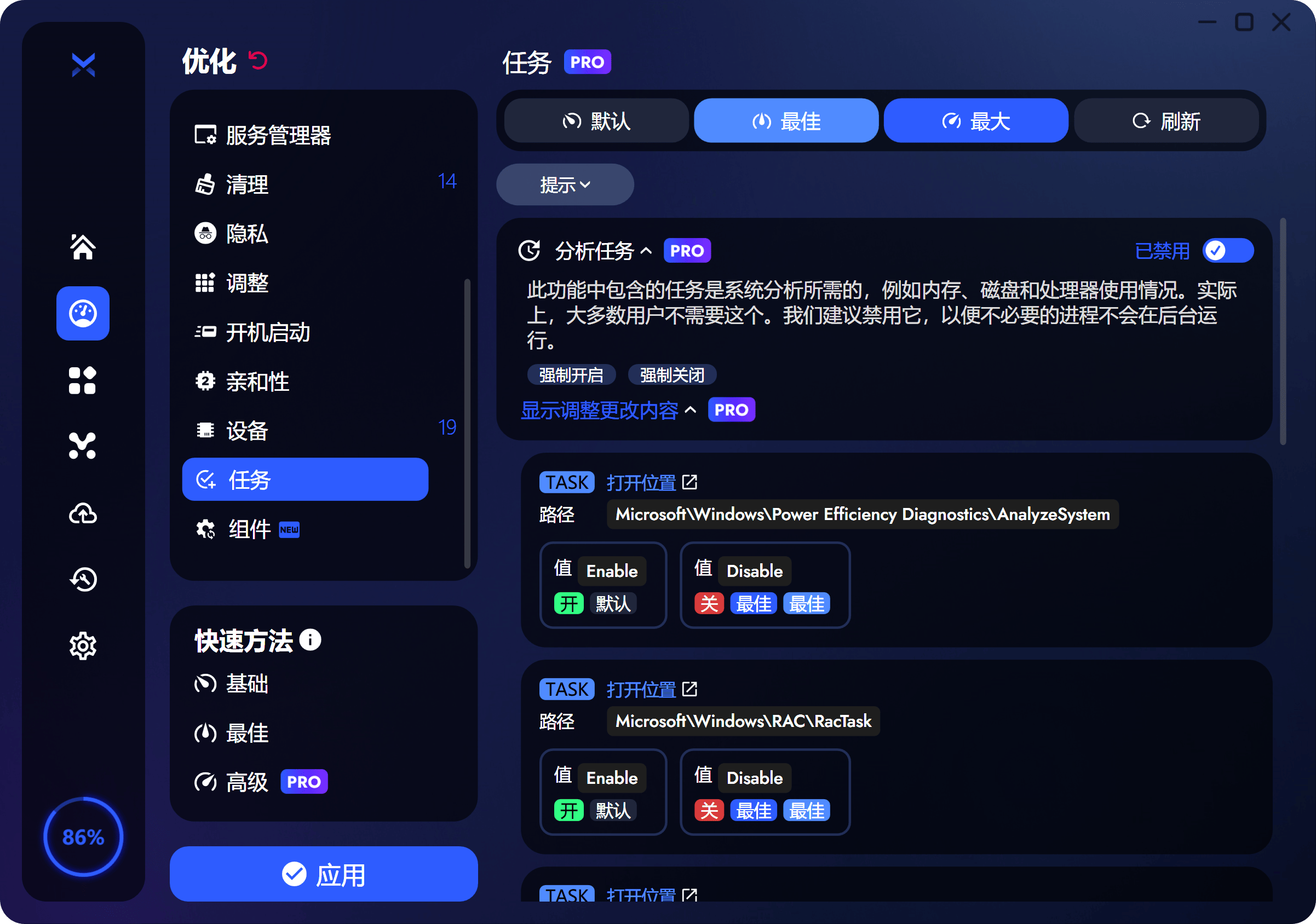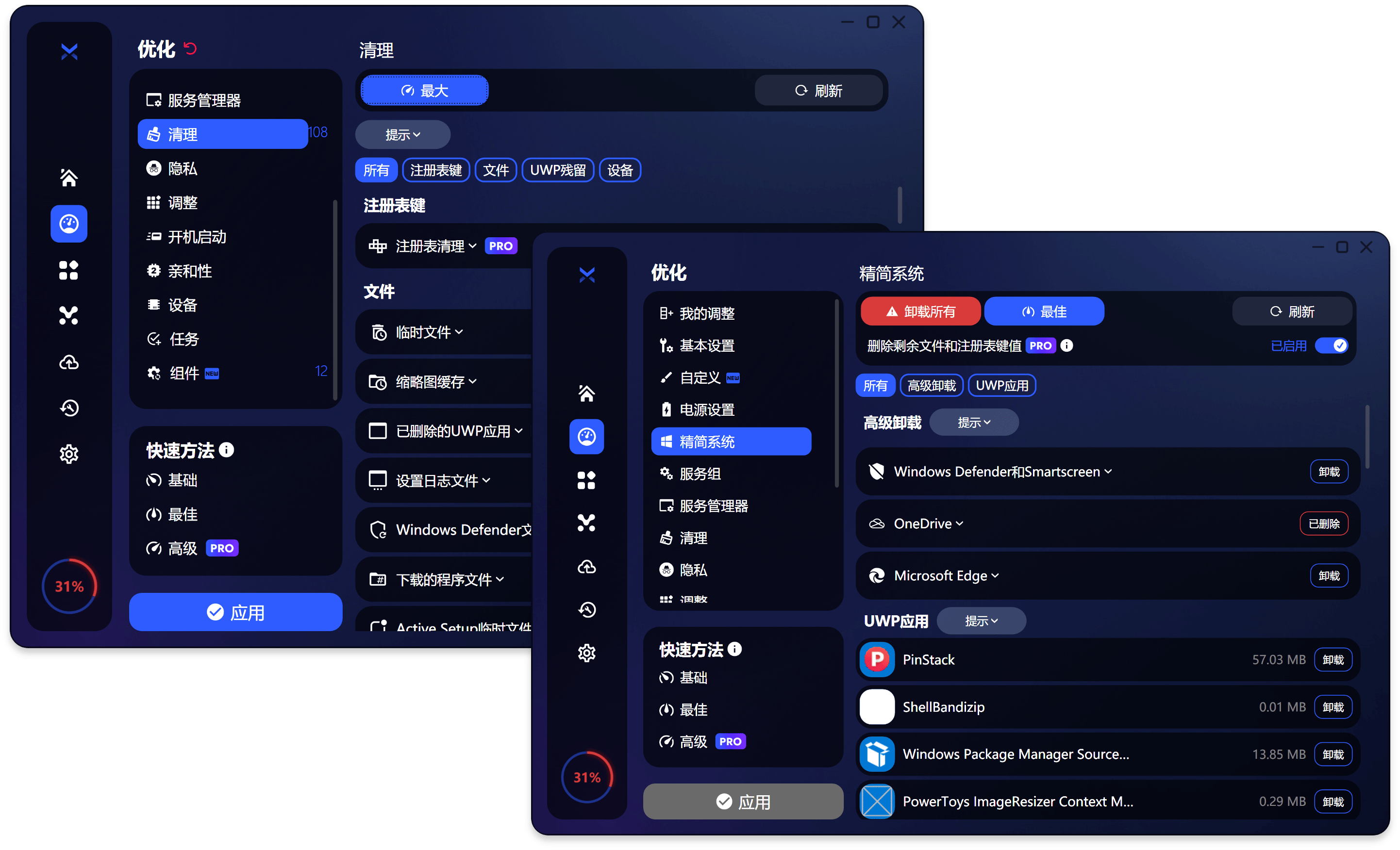优化项内有文字介绍说明和当前状态显示,并且 Pro 用户还能清楚了解改动了哪些注册表等内容。