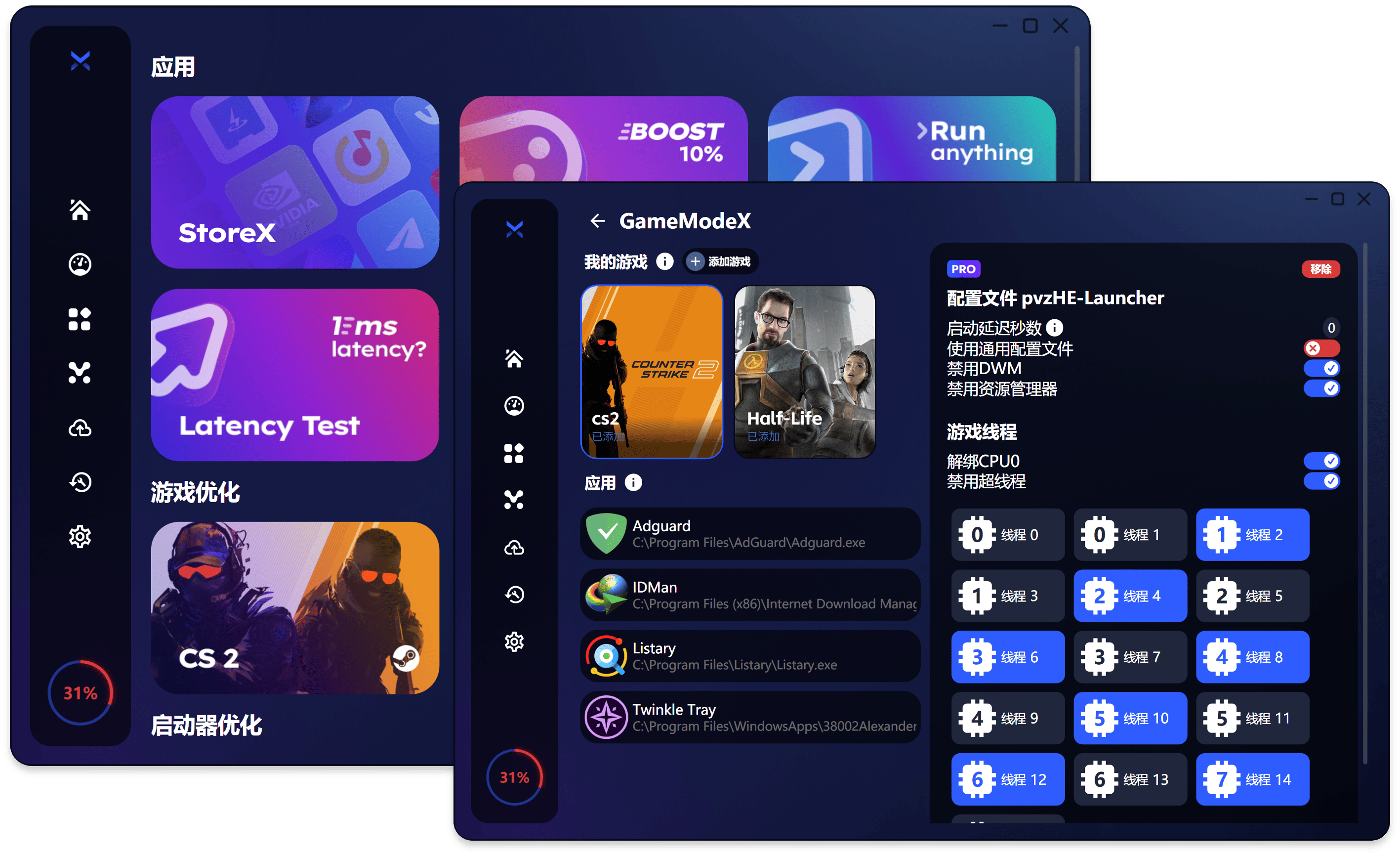 BoosterX 还支持对 CS 2 等游戏进行深度优化,修改 CFG 指令,并提供精简版的 Steam、微软商店。