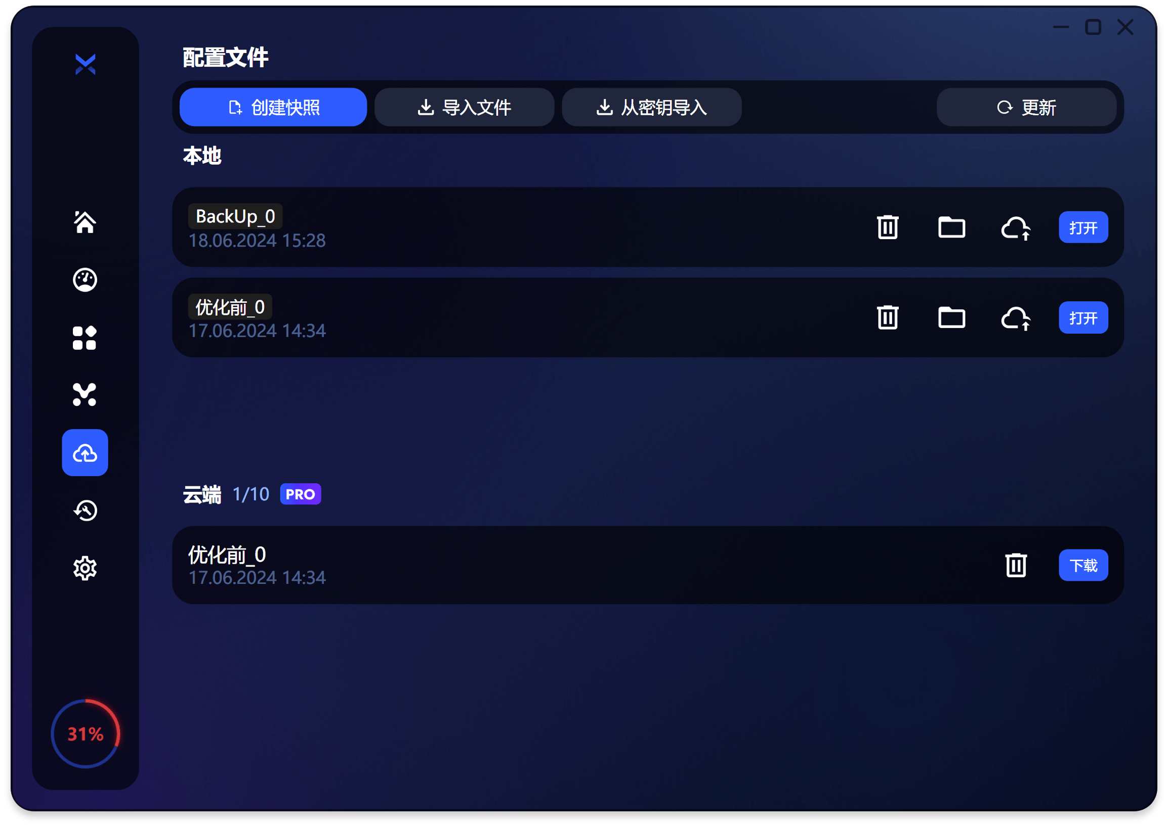优化前可创建配置快照,就算万一有什么意外情况,也能立即恢复!可不能耽误玩游戏的每一分每一秒。