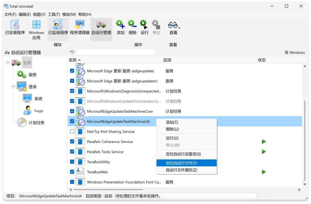 如果觉得电脑开机速度太慢了,还能通过 Total Uninstall 关掉一些软件、服务、计划任务等自启项目,以节省每次开机的等待时间。