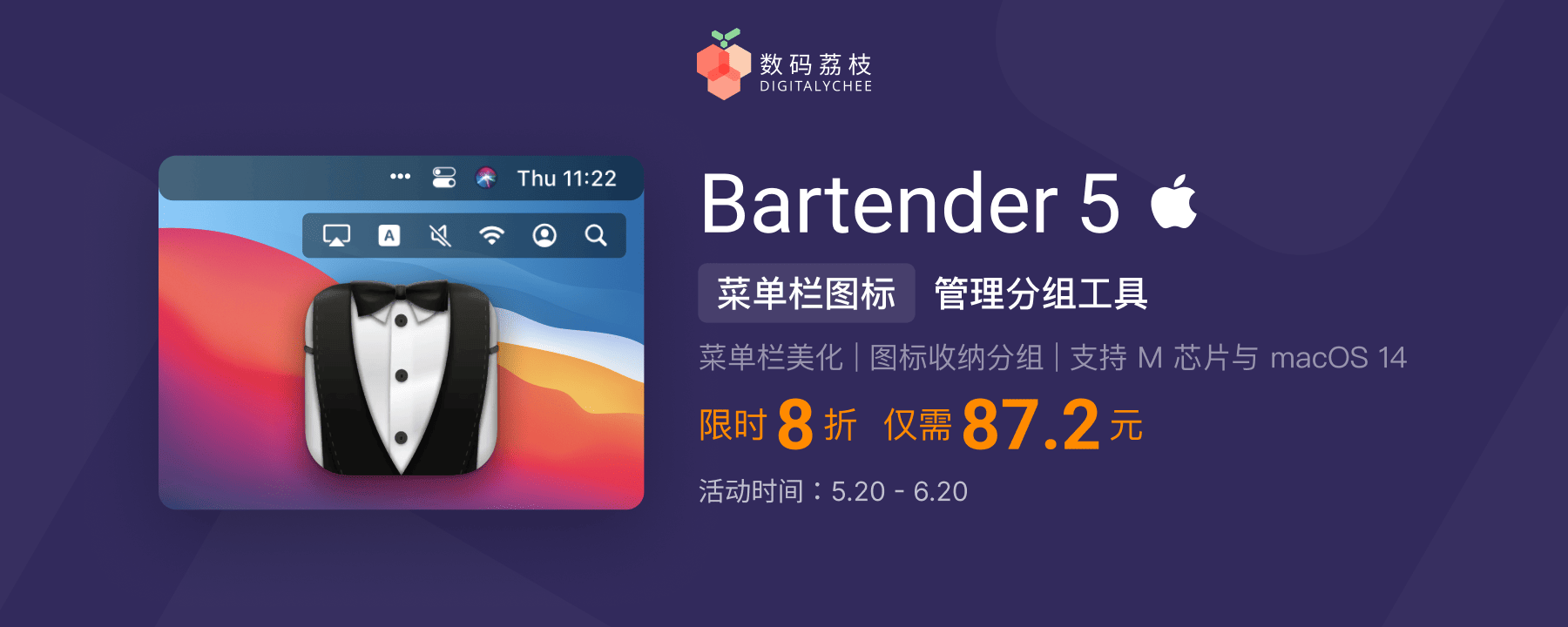 618 大促期间,Bartender 5 限时 8 折优惠,只要 87.2 元即可买断,点击专属优惠链接立即入手,向杂乱的菜单栏说再见!