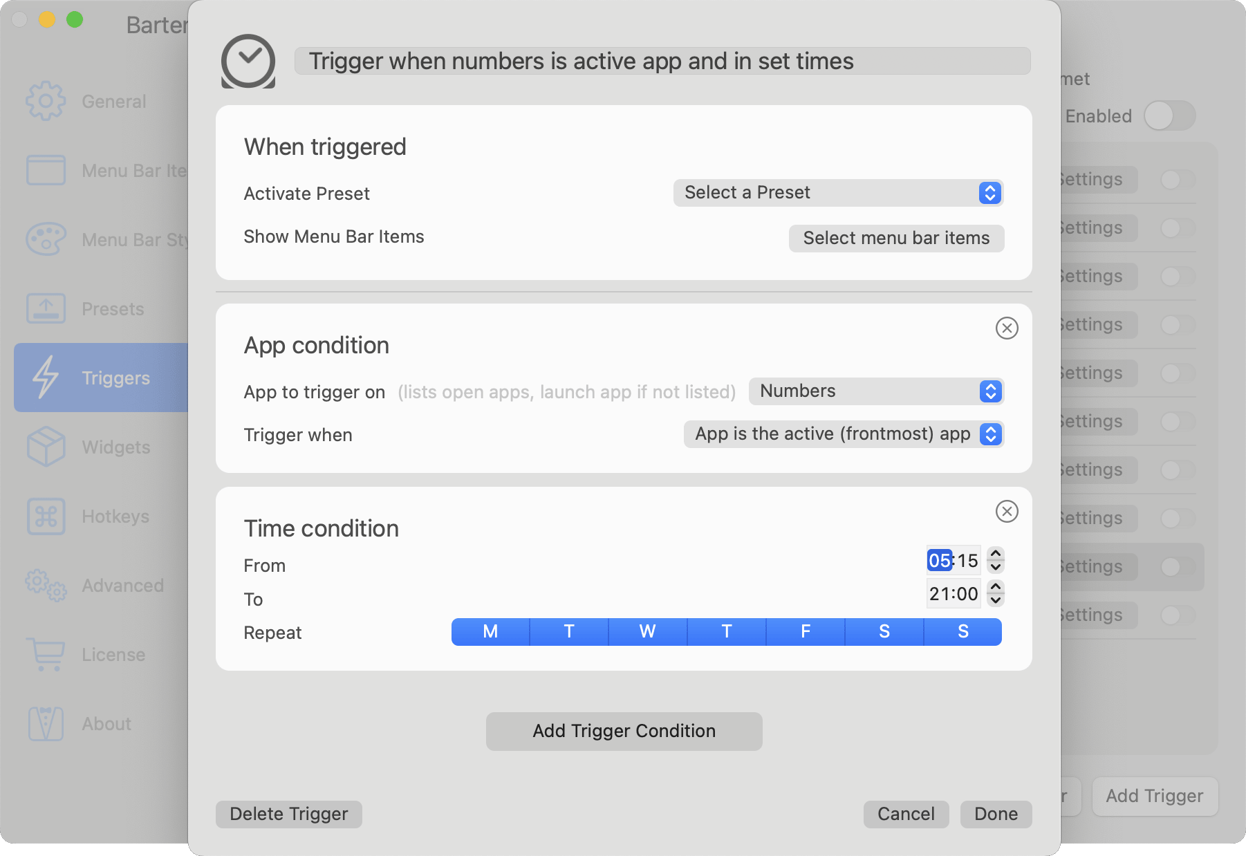 Bartender 5 的触发功能更加好用,可以设定在充电、连接特定 WiFi、特定时间 / 位置时,显示 / 隐藏项目,或开启某个预设场景。